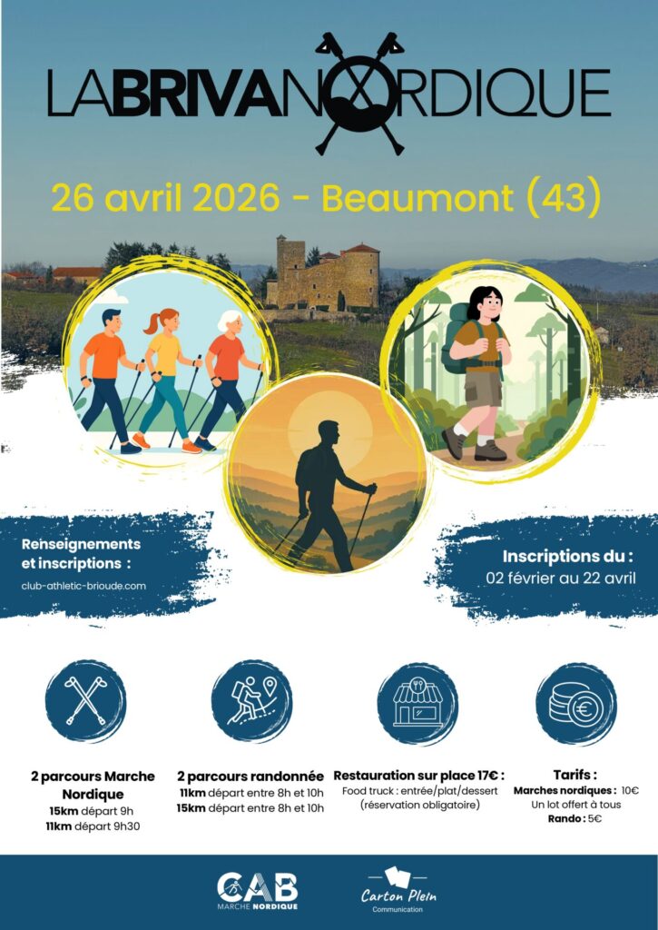 4ème édition de la Brivanordique, journée Marche nordique organisée en Haute-Loire par le Club Athlétic Brivadois à Beaumont le Dimanche 26 Avril 2026. Pour s’inscrire